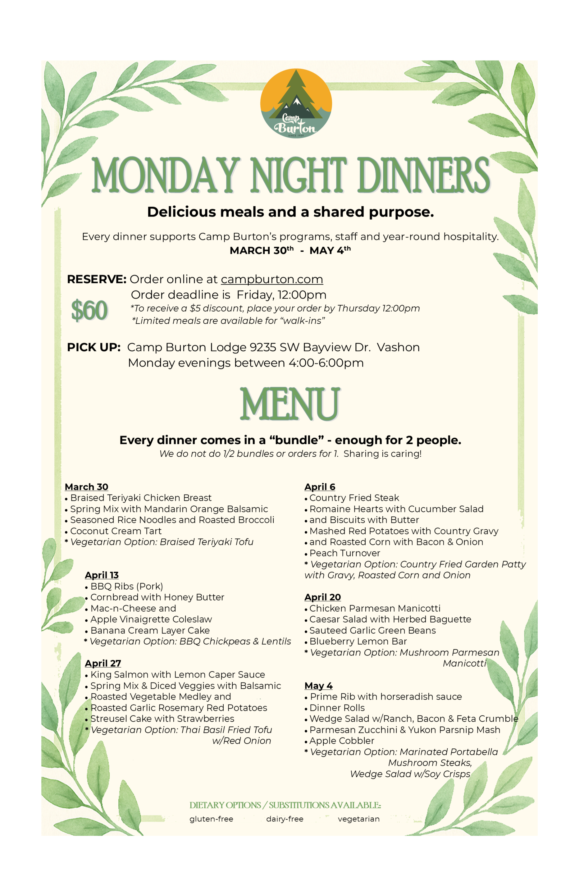Have you heard the good news???Monday Night Dinners are Back! Click on image for more information.